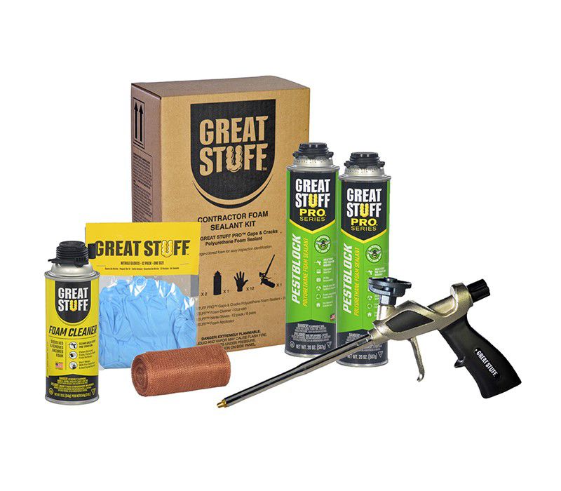 The convenience of the Great Stuff™ Pestblock Foam Sealant Kit has everything you need to help reduce unwanted pests without the use of pesticides. GREAT STUFF PRO™ Pestblock Polyurethane Foam Sealant expands to form a long-lasting, airtight, and water-resistant barrier that blocks critters from entering the home while boosting energy efficiency.